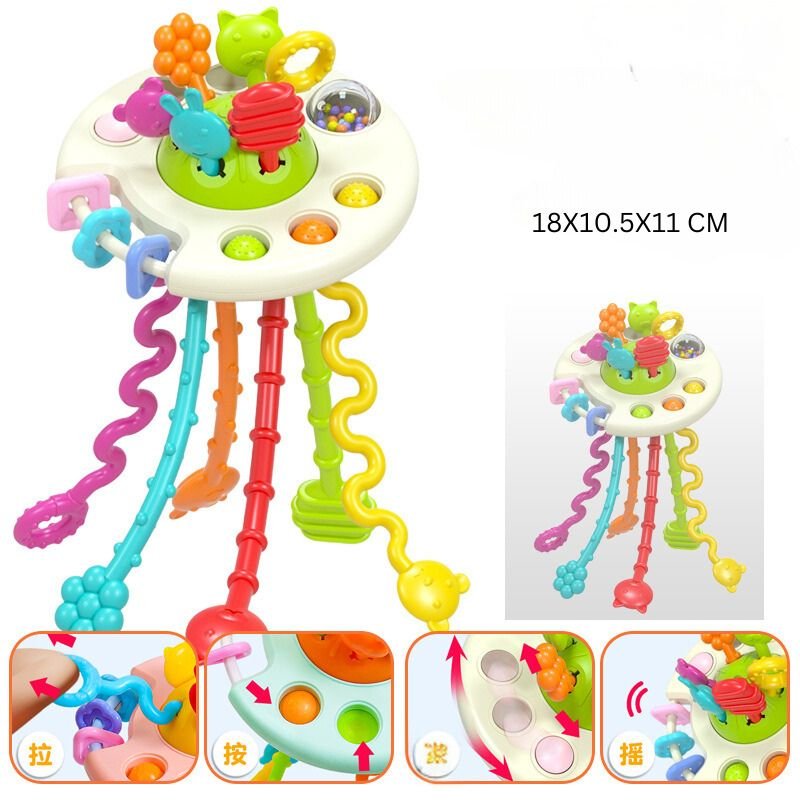 Jucarie interactiva pentru copii, denumita Happy Baby – Pull String Toy, recomandata pentru copii de 10 luni+. Este conceputa pentru a stimula dezvoltarea motorie, cognitiva si senzoriala a celor mici.