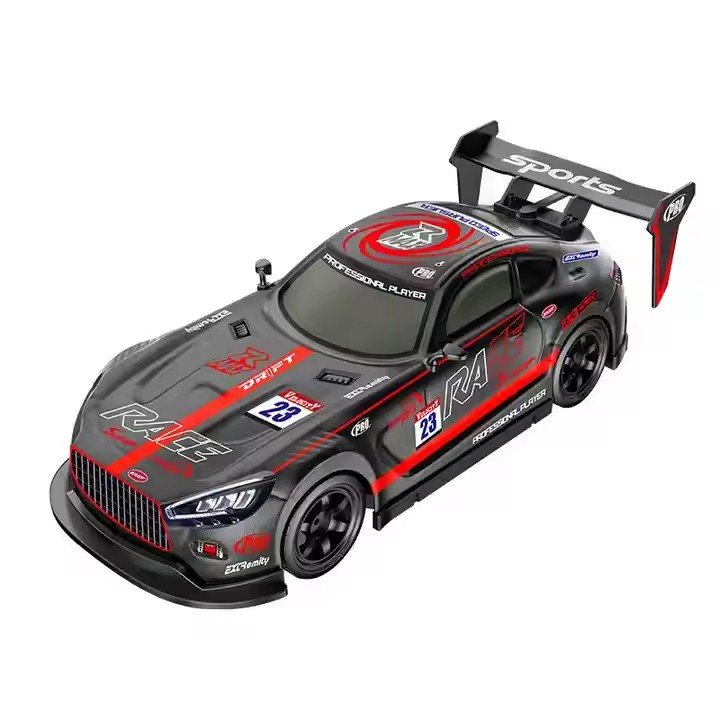 Masina de curse telecomandata cu un design sportiv si agresiv. Are o caroserie aerodinamica, decorata cu un model negru si accente de rosu, precum si diverse inscriptii tematice. Masina este echipata cu un spoiler mare pentru stabilitate, faruri realiste si o grila frontala distinctiva.