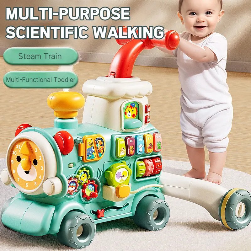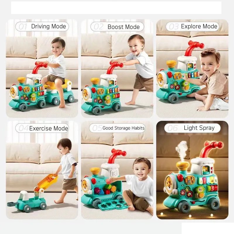 Tren de jucarie multifunctional, conceput pentru a sprijini dezvoltarea copiilor, oferind patru moduri de utilizare: